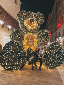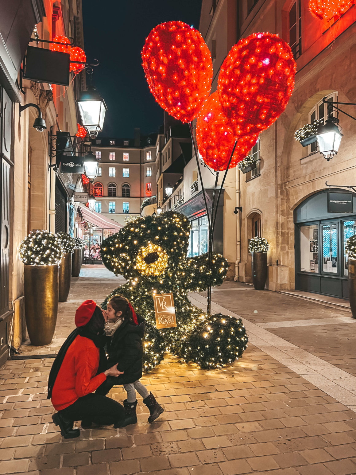 7.¿Conocéis las Rozas Village de Madrid? Se trata de unas mini casitas modo outlet. Ideales y con marcas de lujo. Pues en París se llama «Le Village Royal» y es una mini calle en un callejón, que pasa desapercibida pero que siempre ponen un par de escenarios super decorados y muy navideños que no podéis perderos. El año de 2021 pusieron dos osos gigantes llenos de luces e hicimos unas fotos maravillosas. También las niñas alucinaron y no se querían ir de la zona ¡Es de cuento!