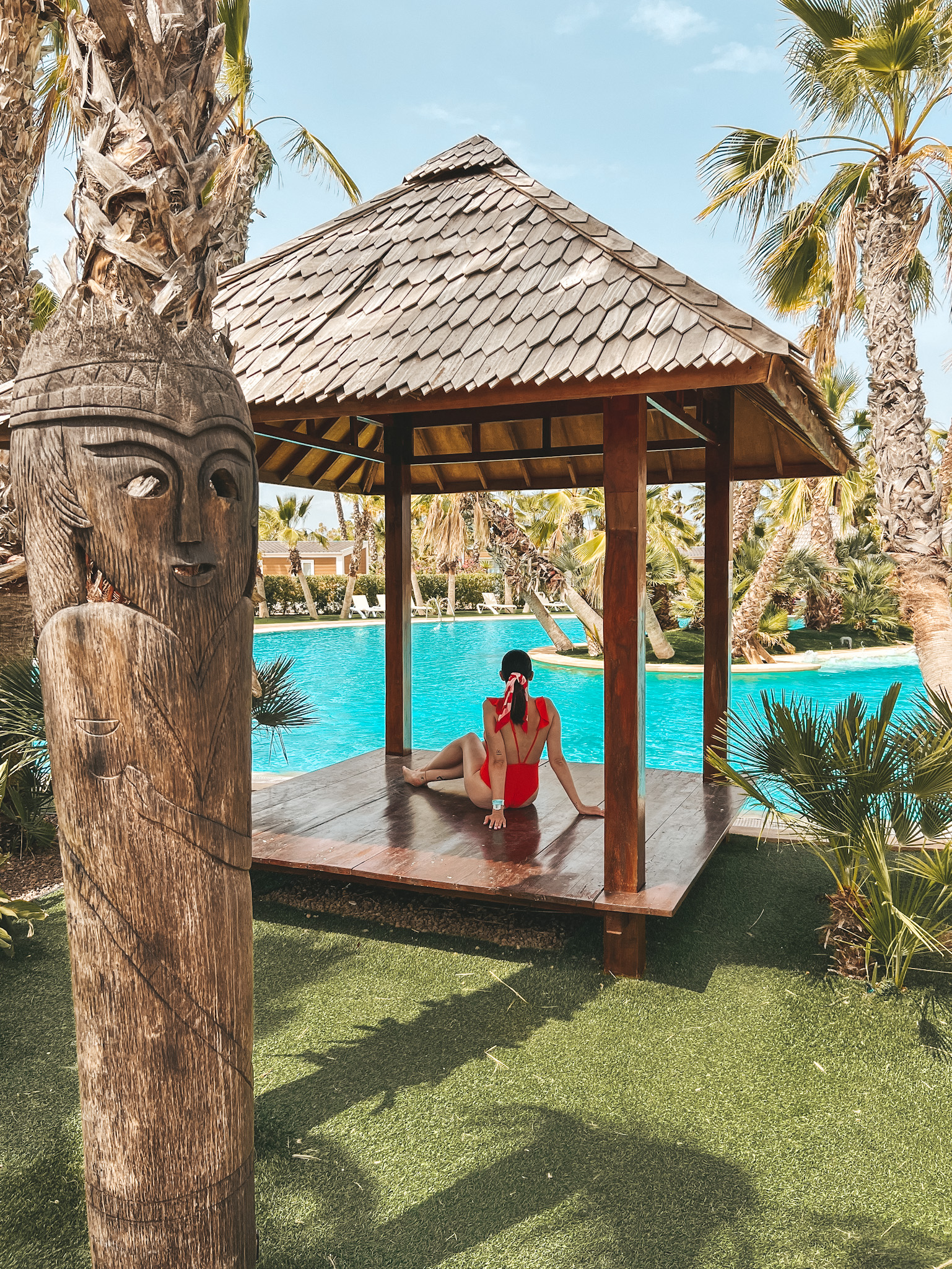 El camping está genial porque está como dividido en dos zonas. La zona más grande, donde hacen la animación, están las salas de juegos y actividades para los peques, el escenario, el spa, el gym… y las piscinas con trampolines tanto para mayores como para más pequeños. Y luego otra zona que parece como si estuvieras en la misma Bali. Más tranquilo, con hamacas y una piscina gigante que parece un lago. Tiene ahí uno de los restaurantes, que es abierto al aire libre y un bar de piscina para tomarte algo. Este lugar está más despejado ya que los niños siempre prefieren la otra piscina.