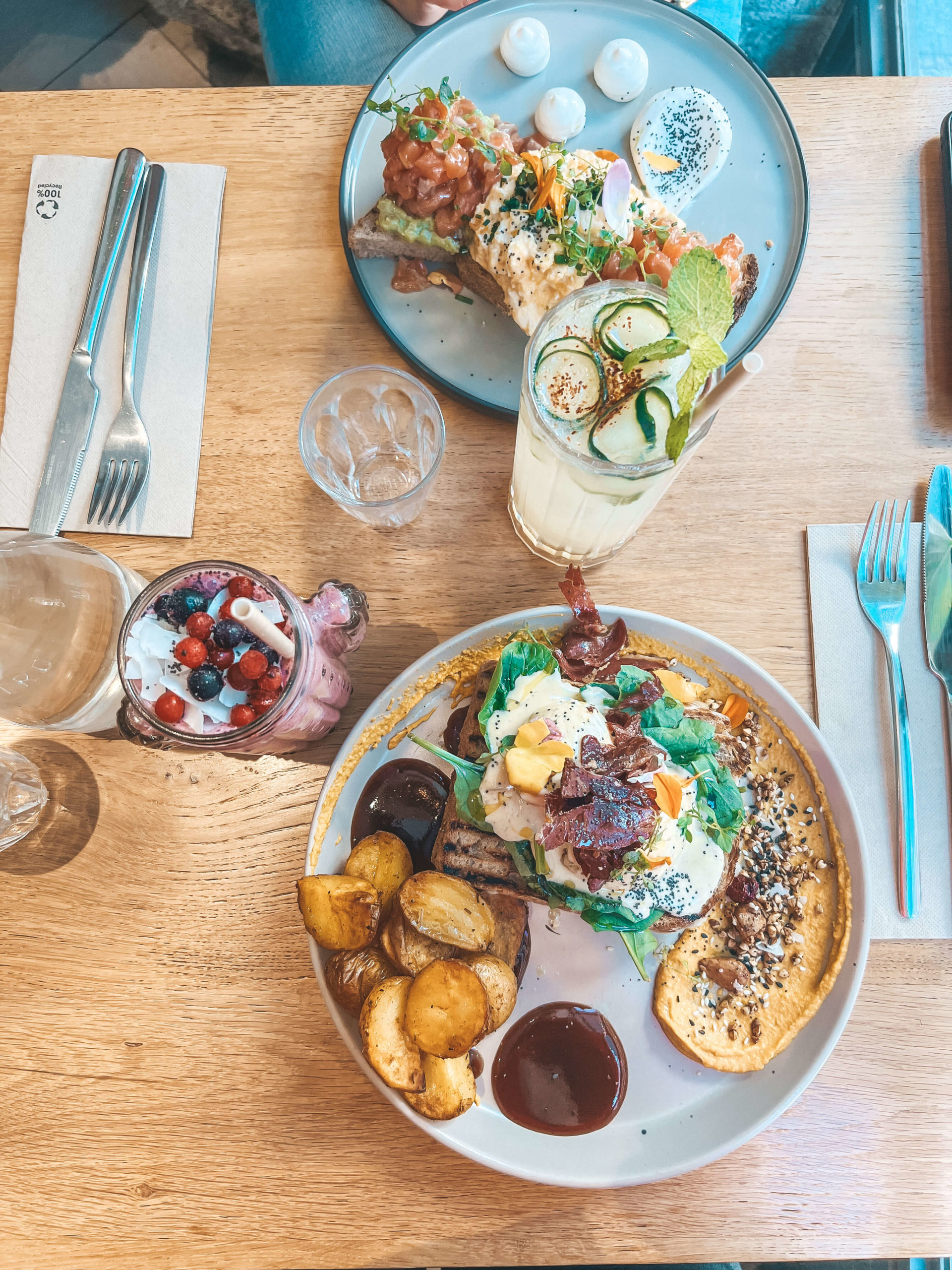 ¿Sabías que siempre que nos preguntáis por algo original y cool os recomendamos este sitio? ¡Repito! Es mi sitio favorito en la ciudad para poder hacer algo especial. Los platos son muy grandes y contundentes y tengo que deciros que cuando se utilizan alimentos 100% naturales y bien cocinados llena mucho más. ¡No solo eso! Los platos, como ya os digo, son muy generosos y ya con un plato y una bebida será más que suficiente. Así que deja ese mini hueco para compartir un postre rico. Y si quires alguna recomendación de bebidas, mi zumo favorito es el Finns Forest, lleno de frutas del bosque, con ralladura de coco y leche de avena. ¡Ideal para llevar bien el día!