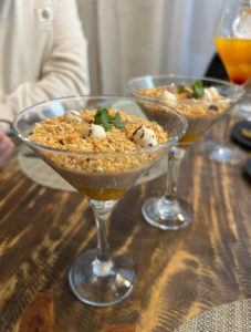Nosotros nos decantamos por probar esa locura de croqueta líquida en copa de cosmopolitan rellena de pato, foie y boletus. ¡Creo que soñaré el resto de mi vida con ese sabor! y el crunchy de jamón ibérico y pan rallado era oro.