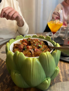 Seguimos con las alcachofas en dos cocciones con natillas de sobrasada y torreznos, ¡qué rico! El sabor de la salsa, con esas alcachofas tan blanditas y sabrosas… claramente se deshacían en el paladar. Saboreamos hasta el último pincho con un gusto increíble.