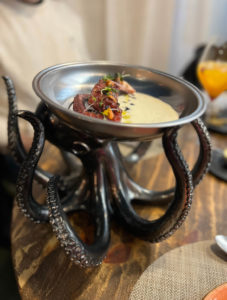 Si eres más de mar, el pulpo braseado con romesco de remolacha servido en ese recipiente de pulpo tan atractivo, me recordó a Úrsula de la Sirenita, con los tentáculos de la malvada bruja y el rico sabor de la princesa. ¡Un super combo!