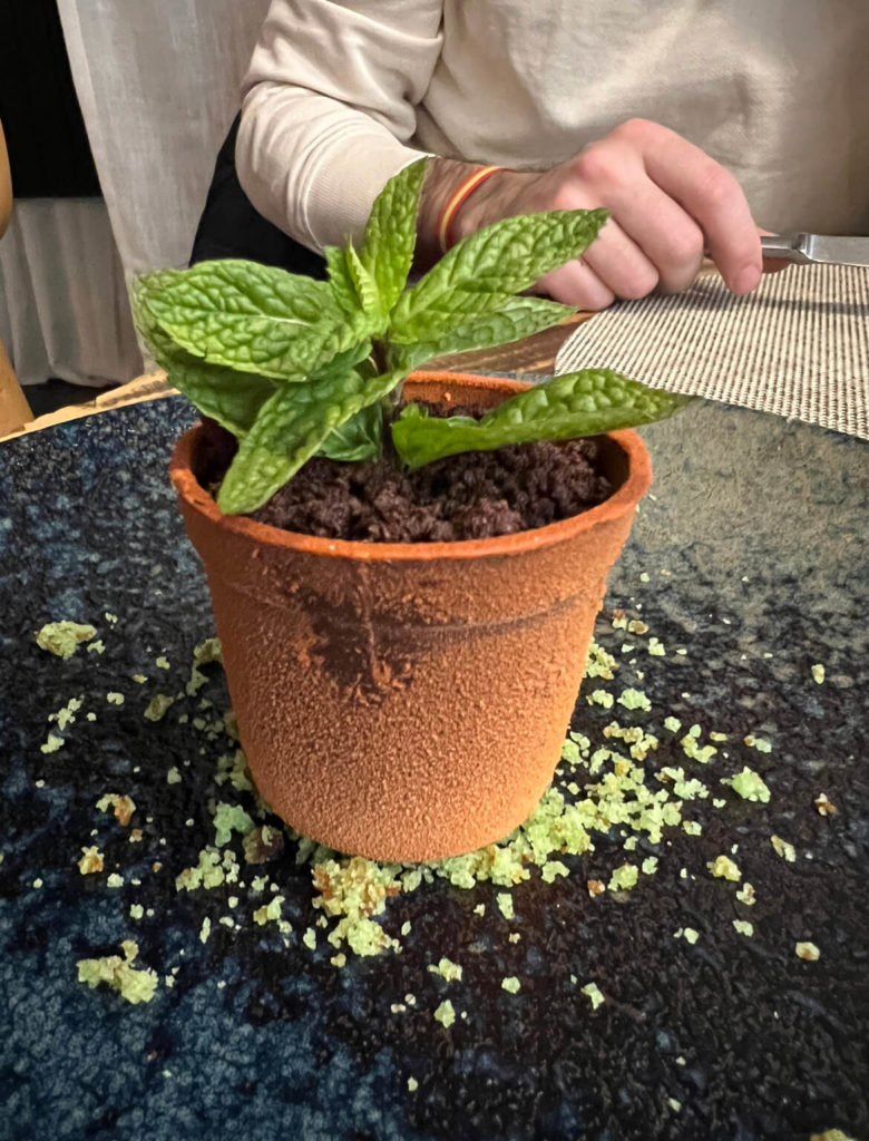 Déjate hueco para el postre porque el trampantojo de tiramisú está para chuparse los dedos. Una maceta con cobertura de chocolate, mousse de café con crema de mantequilla y gelé de café, para saborear cada pedacito y culminar una de las experiencias gastronómicas más originales y atrevidas.
