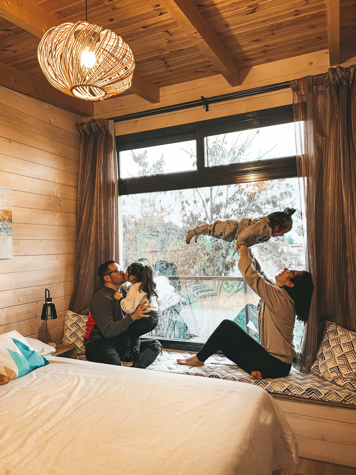 Nos hospedamos justo en la cabaña familiar, una suite con todas las comodidades que nos sorprendió muchísimo, ya que estaba muy bien equipada, no solo para pasar un fin de semana, sino para unas mini vacaciones. El alojamiento cantaba con cocina (lavadora, lavavajillas, cafetera, micro, placa para cocinar…), dos aseos, dos habitaciones y un salón comedor diáfano. Es preciosa y con unos ventanales gigantes que harán la estancia puro espectáculo, ya que se ve toda la vegetación.