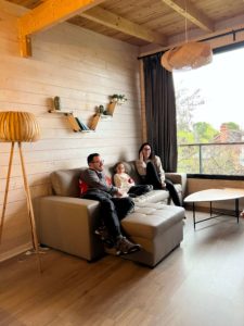 Es cierto que cuando fuimos nos hizo mal tiempo, hacía mucho frío y llovía, pero creo que nos hizo el tiempo perfecto para estar durante el primer día metidos en la cabaña, ver pelis en familia, echar unas risas y cenar en frente de la chimenea de pallets. ¿Sabéis qué es lo bueno? Qué justo este tiene un terrenito amplio, con un mini jardín con vistas, barbacoa y una cama elástica de saltar, ideal para los peques. ¡La cual disfrutamos de un mini rato!