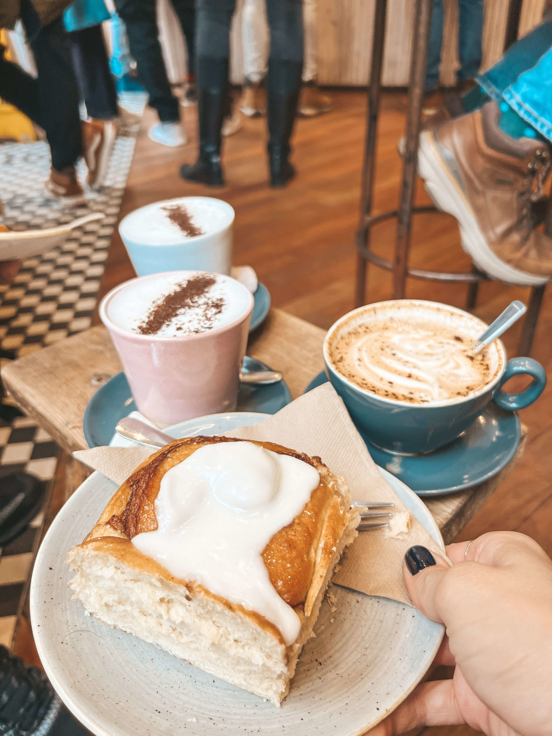 ¡Espera! ¿Eres de café? Me pedí un capuchino que estaba delicioso con ese toque a chocolate empolvado sobre la nube de cremosa y espumosa del café. Los chicos se pidieron un chocolate caliente de choco blanco con marshmallow y nata. ¡Qué delicia! Además probamos varios dulces, como los cinnamons rellenos o unas cookies increíbles de avena y chocolate. Aproximadamente son unas 5 Libras una bebida y un dulce, pero merece la pena el lugar tan acogedor, ¡Y si llueve merece mucho más la pena!