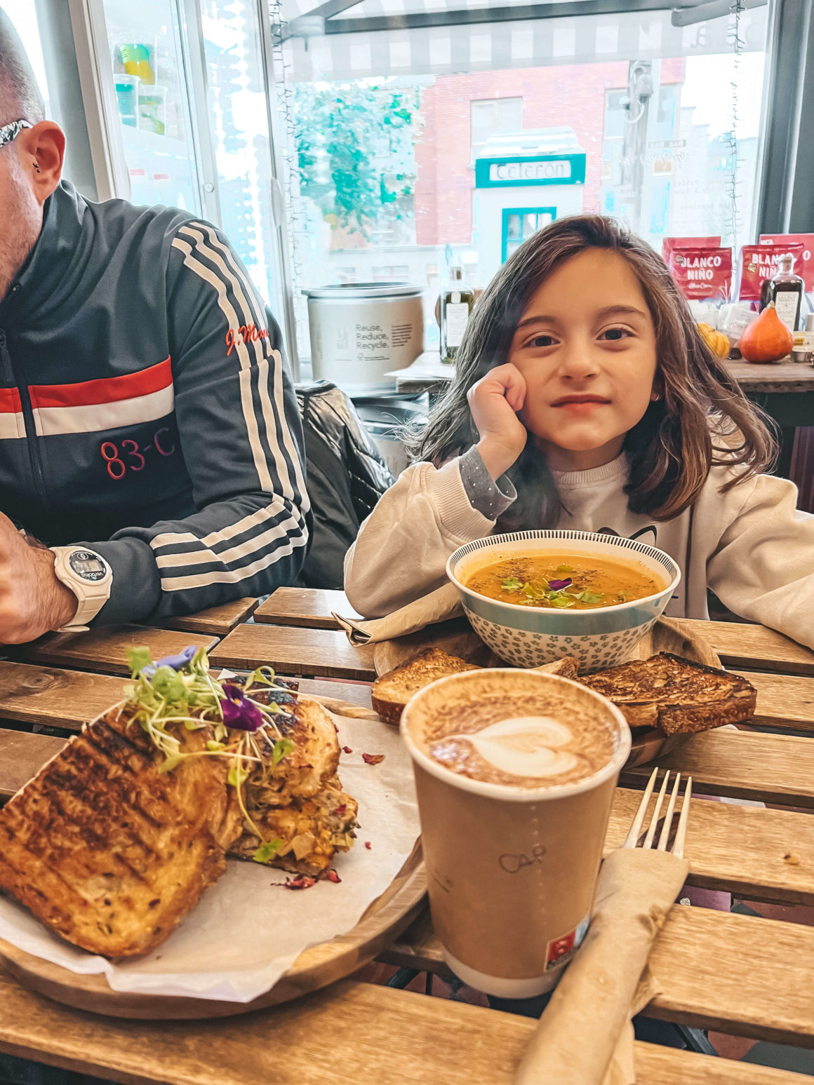 Sin duda alguno, uno de los cafés mas ricos (volviendo a la comida). Me pedí un capuccino y estaba deli, aunque el hot chocolate también estaba irresistible con esa natita. Nosotros degustamos su mini almuerzo. Ademas los platos eran grandes, contundentes y para nada caros (entre 5€ y 8€). El menú va cambiando, pero nosotros elegimos la sopa de butternut squash (increíble y con un toque brutal), el roast chicken sandwich y el Irish cheddar cheese toaste con chorizo. ¡No se que estaba mas rico!